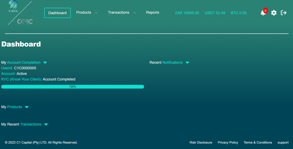 Unlock financial clarity and personalized control at the top left-hand side. Monitor your ZAR, USDT, and BTC balances, receive timely notifications, access settings, and effortlessly log out.