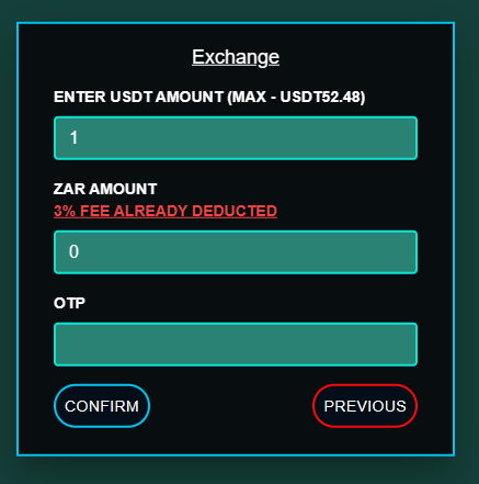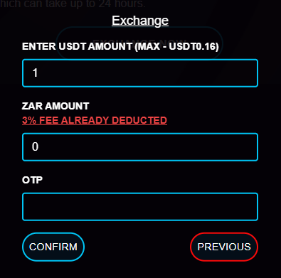 Enter the amount to be exchanged and the system will automatically display the amount you will receive after a 3% fee deduction. Enter the OTP received via email or SMS (as selected with registration) and click on “confirm”