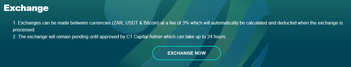 Information will be provided regarding various exchange options. This can be utilized before purchasing a product or before a withdrawal in the currency required. Please note that a 3% fee will incurred for all exchanges and will be automatically calculated and deducted before the exchange is processed. You will be able to see the actual exchange amount before submitting the request.